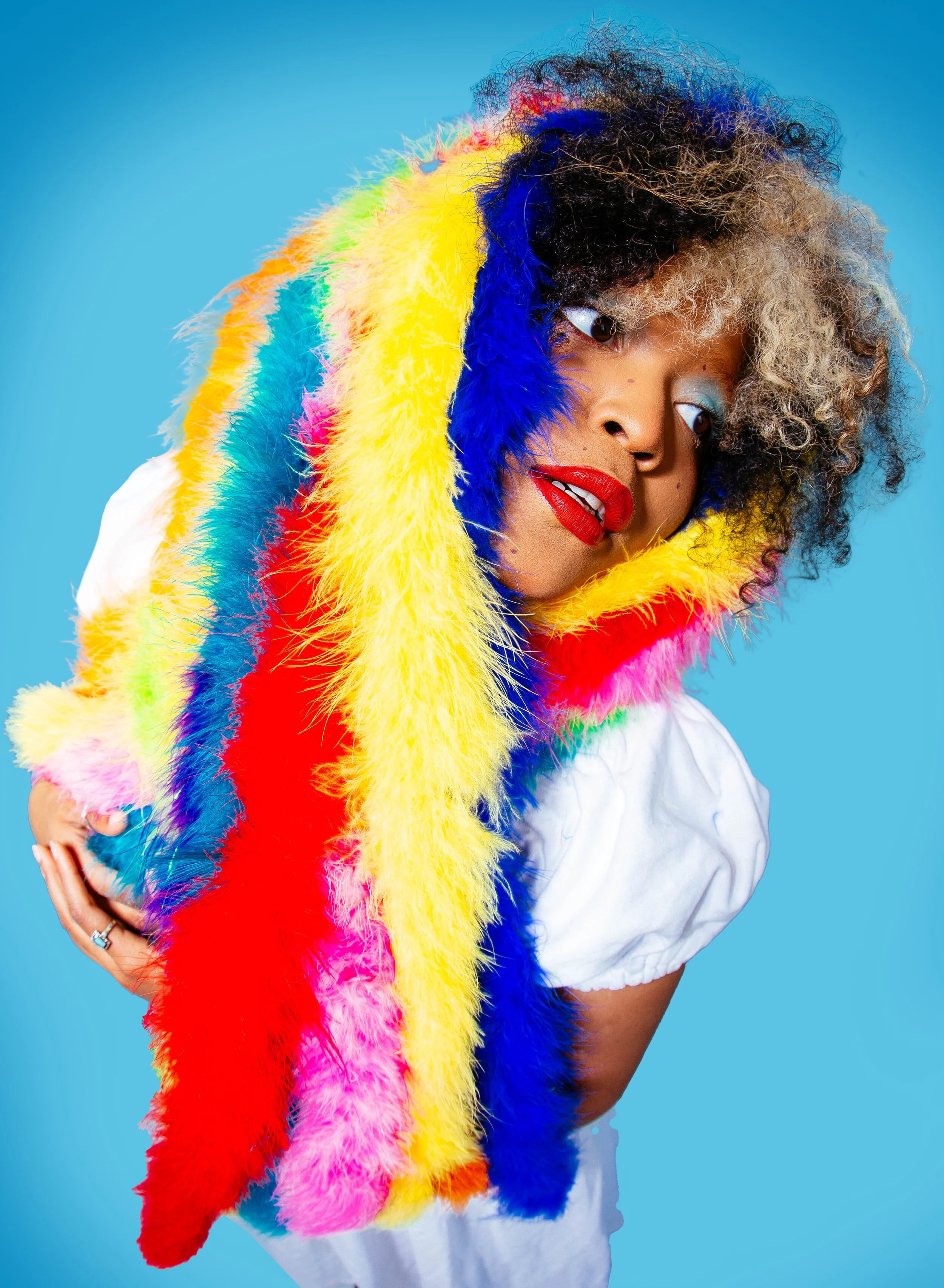 A technicolor, large-scale digital illustration of a fantastical Pride parade scene with Santa Monica as its backdrop. It is a celebration of the resilience and ability to continue to find joy that the QTBIPOC communities of LA have displayed in the past year.